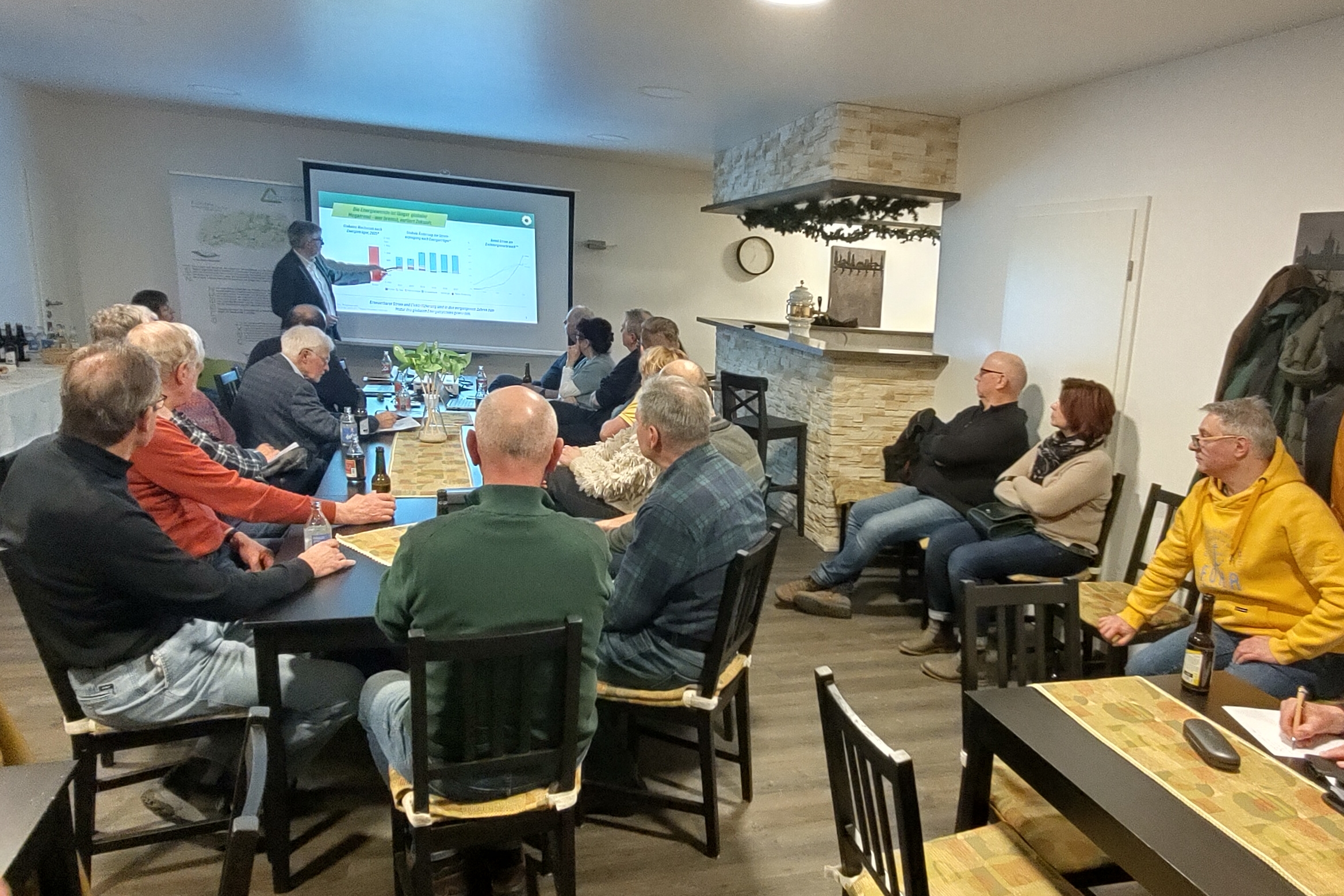 Nach einem Grußwort von Bürgermeister Heiroth von Haynrode, stellte der Projektmanager von „ECO2WEL“, Thomas Knoche in einer Präsentation die innovativen Ideen des Projektes vor: Dem Aufbau von Solaranlagen auf Dächern von öffentlichen Gebäuden der Gemeinde mit dem Einbau von Wärmepumpen, aber auch verbunden mit Ladesäulen für E-Autos, die dann zudem die Möglichkeit zum bidirektionalen Laden beinhalten. Hierbei werden E-Autos als mobile Speicher und Netzstütze genutzt, falls die Sonne nicht scheint und der Wind nicht weht. Dies kann aber auch in Unternehmen genutzt werden, um die Spitze im Stromverbrauch eines Unternehmens zu senken und somit generell dessen Energiekosten. Ferner beinhaltet das Projekt moderne digitale Lösungen, die enorm Kosten bei der Brandschutzüberwachung in der Gemeinde Haynrode einsparen.